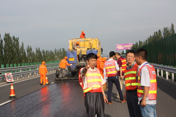 京張高速公路2015年路面微表處和標(biāo)線補劃工程經(jīng)過充分的施工準(zhǔn)備于8月6日正式開工。王啟成總工程師到施工現(xiàn)場檢查了施工情況,對工程的質(zhì)量控制和安全保暢工作表示滿意。本工程是今年迎國檢的重點施工項目之一,總投資249.94萬元,預(yù)計8月30日前全部完工。(王喜會)。