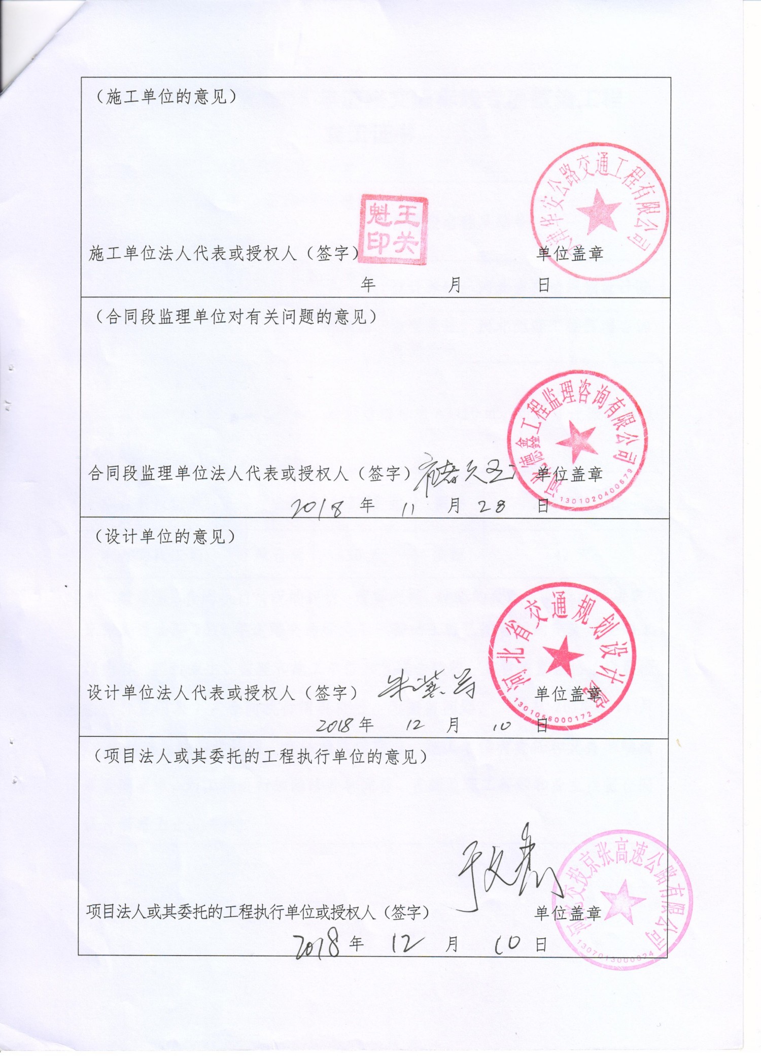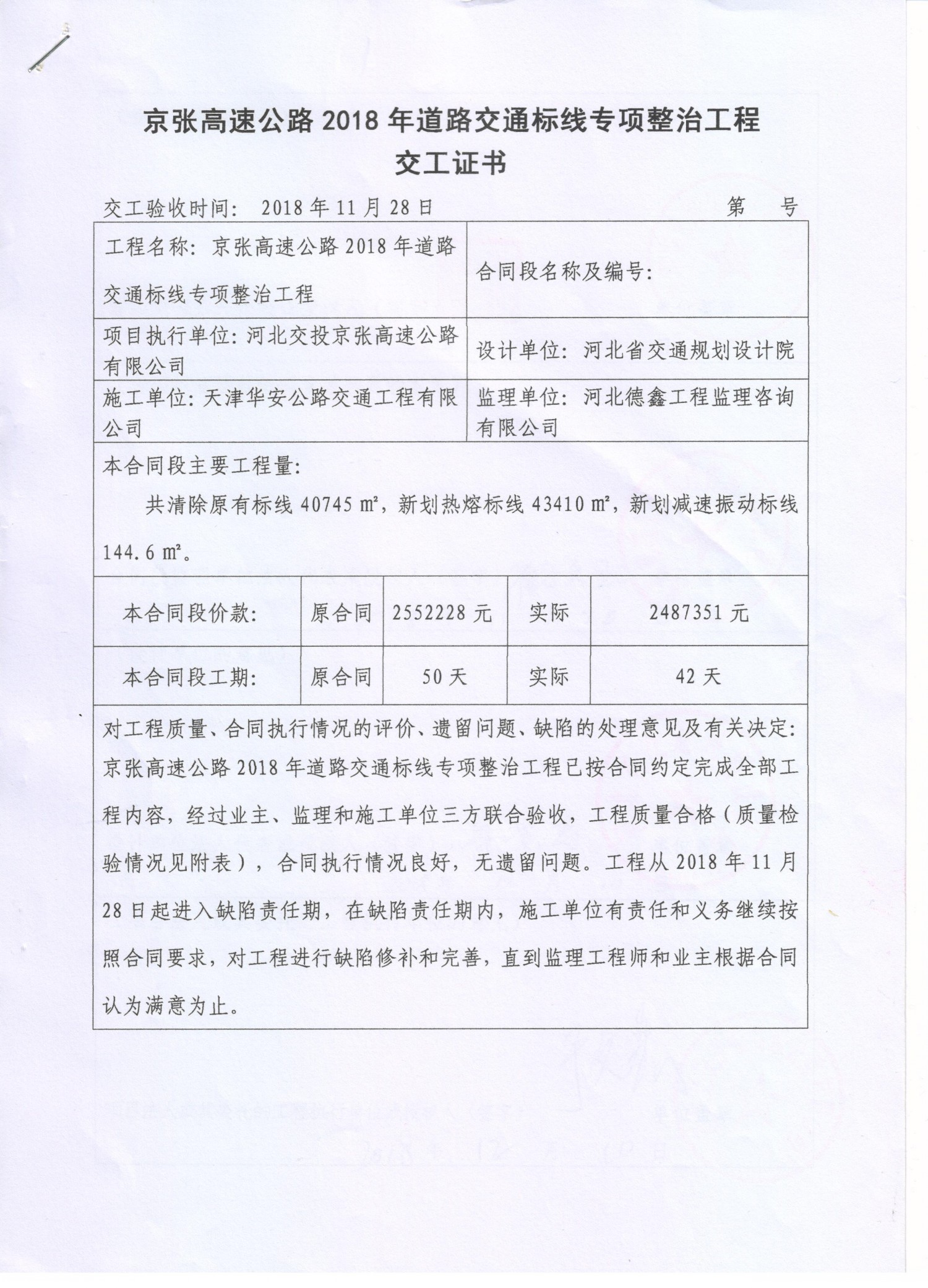 京張高速公路2018年道路交通標(biāo)線專項(xiàng)整治工程交工證書